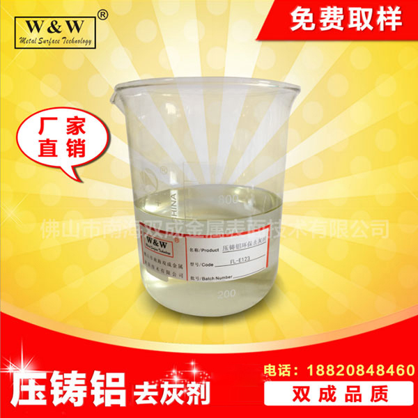 本产品是一种压铸铝专用的去灰剂:能有效去除铸铝件表面的污渍(譬如:经化学抛光,碱腐蚀后产??生的黑灰,)获得清洁光亮的表面;易清洗,不污染 后续处理;完全不含传统的三酸(硝酸、磷酸,氢氟酸),环保。
