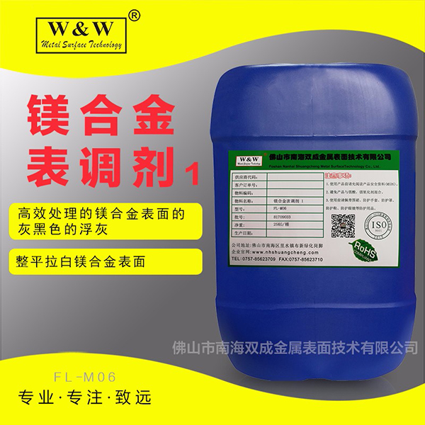 FL-M04是由多种络合剂、抗氧化剂、活性剂复配而成的镁合金专用的表调剂。该产品能有效的处理的镁合金表面活化或者酸洗后的灰黑色的浮灰,整平、拉白镁合金表面,处理过程中一定要配合超声波。